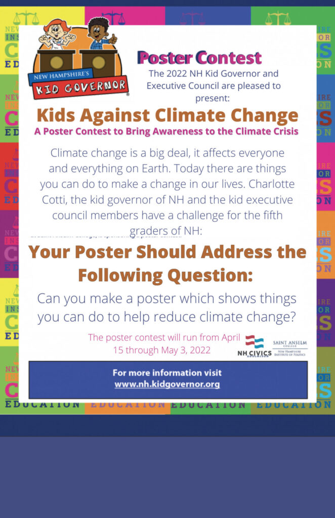 Climate change is a big deal, it affects everyone and everything on Earth. Today there are things you can do to make a change in our lives. Charlotte Cotti, the kid governor of NH and the kid executive council members have a challenge for you: Can you make a poster which shows things you can do to help reduce climate change?